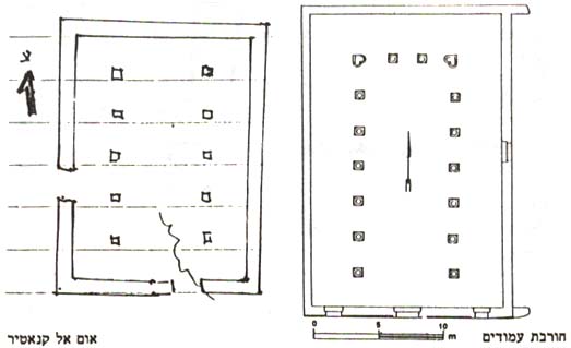 גם בגולן נמצא בית-כנסת מטיפוס זה - קצרין. בית-הכנסת שטחו 15.4 18X מטר, בנוי בציר צפון-דרום. פתחו הראשי שבצפון נשתמר בשלמותו. מסביב לקירות בית-הכנסת - ספסל ישיבה. הוא מחולק על-ידי שתי שורות עמודים, ובקירו הדרומי - במה. מלבד הפתח הראשי, ישנו פתח נוסף ממערב. בית-הכנסת נוסד בסוף המאה הרביעית, והיה קיים עד מחצית המאה השמינית.