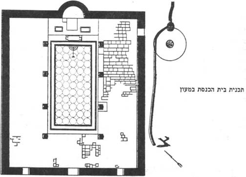 17. כך בבית-אלפא ורחוב שבעמק. ברמון, שמדרום לקיבוץ להב, בשלב השני של בית-הכנסת שנבנה במחצית המאה הרביעית, הוקמה במה בקיר הצפוני, הפונה לירושלים, והפתחים הם בדרום. בך גם בשלב המאוחר (שלהי המאה השישית). במעון שליד קיבוץ נירים, הכניסה בדרום-מערב, והתפילה לצפון-מזרח - כיוון ירושלים. באמצע המאה השישית נבנתה גומחה בקיר הפונה לירושלים.