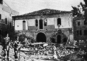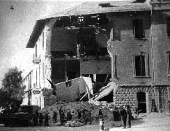 After the baptism of fire, it was decided to take a more daring step and attack the nerve center of British rule, British Intelligence and the police. Once again the operation was co-ordinated to take place simultaneously in the three large towns. In Jerusalem, the task was more difficult since the British Intelligence was housed in the Russian Compound, as were the police headquarters and the law courts. Despite the difficulties, the Irgun fighters, under Rahamim Cohen (Gad) succeeded in infiltrating the British Intelligence offices and placing the explosives. However, the duty officer that night, Sergeant Scott, on a routine patrol of inspection noticed a suspicious movement on the balcony. He was injured when fire was opened on him, but before he collapsed he succeeded in shooting one of the Irgun fighters, Asher Benziman (Avshalom). Despite the exchange of fire, the sappers succeeded in preparing the explosive devices and retreating. Several minutes later, there was a loud explosion and the building collapsed. Asher Benziman succeeded in escaping, but died of his wounds shortly afterwards - the first casualty of the revolt. The British officer also died as a result of his injuries.