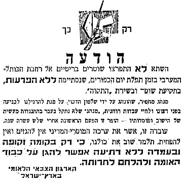 In summer, 1944, the question of the shofar ceremony at the Wall was raised again. This time the Irgun decided not to confine itself to bringing in a single shofar-blower to mark the end of Yom Kippur. Several weeks before the High Holydays, the Irgun began to issue warnings to the British to keep away from the Wall, and announced that any policemen found near the Wall on Yom Kippur would be punished. As the fast-day approached, the warnings were reiterated daily. Nine proclamations were issued in all; the following is the text of one of them: