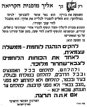 On the evening of Wednesday, March 12, members of the Fighting Force assembled at an apartment in Haturim Street, which had been placed at the disposal of the underground. Yehoshua Goldschmid (Gal), who was commanding the operation, briefed them, and the fighters split up into four squads. Two-man squads were ordered to set up road-blocks; they placed barrels in the middle of the road, with a notice on each in Hebrew and English: