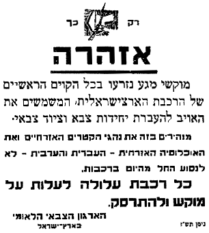 On January 31, 1947, Kol Yerushalayim (The Voice of Jerusalem) broadcast a Mandatory government announcement to the effect that, as a consequence of the recent disturbances in Palestine, it had been decided that British women and children and other British nationals whose presence in Palestine was not essential, would be evacuated. Soon after, some 1,500 men, women and children were evacuated by train to Egypt and transported from there by sea to England.