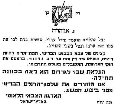 No longer will you whip the citizens of this country, whether Jews or Arabs, for we, the soldiers of Israel, have rebelled against your rule and its despicable methods. |